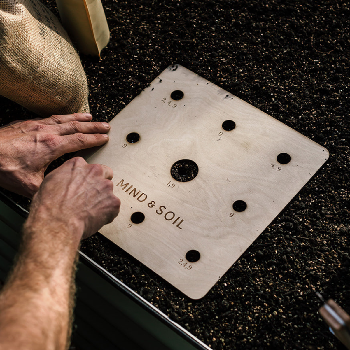 - Place the Square Foot Spacing Tile in your garden and gently press down to make an outline.